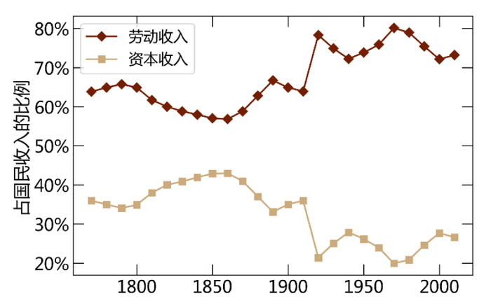 注:图表为英国1770-2010年间劳动和资本在国民收入中的份额,法国等其他一些国家也存在类似趋势。