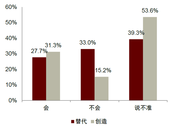 注:图表所示为2024年4月中金公司进行的上市公司问卷调查结果。红色柱表示预计AI替代现有职工,灰色柱表示预计AI会创造新的就业岗位。为更好对比,“会产生新岗位,但我不知道会是什么岗位”的回答在图中归入“说不准”类别。