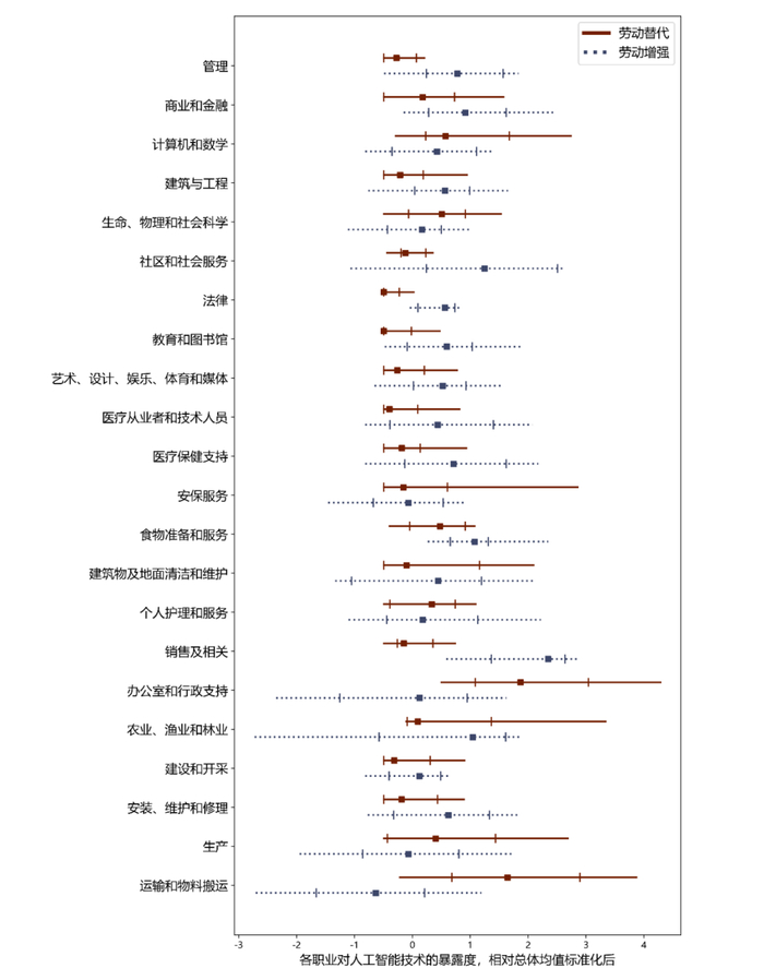 注:大于零表示该职业受AI的影响程度大于各职业的均值;方块表示中位数,竖线表示p25和p75数据点,直线两端表示p10和p90数据点。直线显示了每个SOC-2职业大类下各约30多个SOC-6具体职业的AI暴露分数分布。