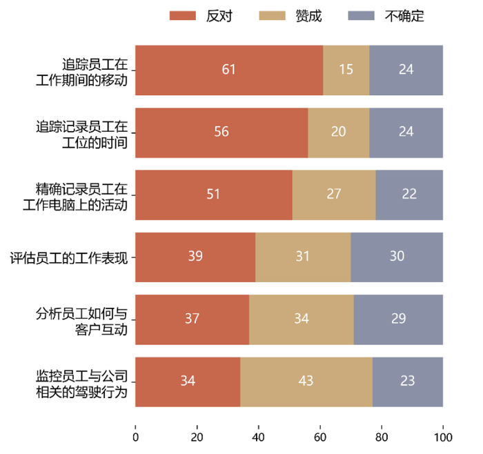 图表4.14:美国人对公司使用人工智能监控不同类型工作相关行为的看法比例