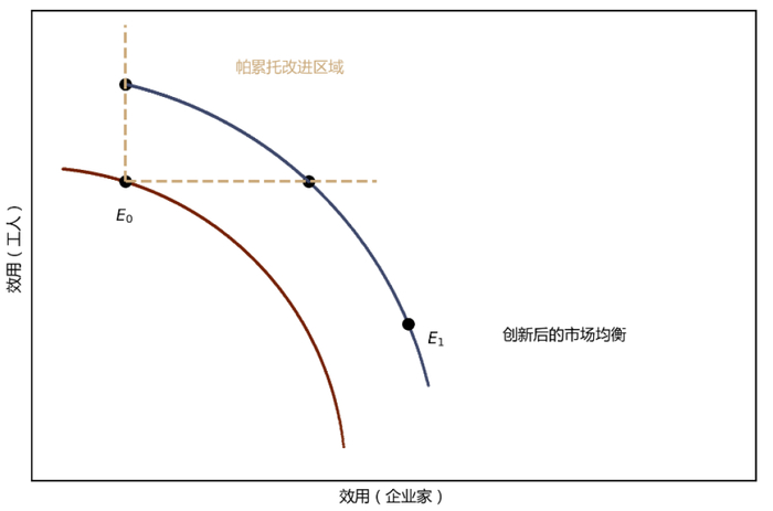 政府在初次分配阶段的政策可以帮助劳动者获取技能保有工作,但现实中许多人难以通过职业培训实现再就业。因此,除了提供培训机会,政府还需要考虑再分配政策,对受影响人群提供基本生活保障和支援。首先,再分配在AI时代不但可行,而且可以深化促进技术进步的政治基础。Korinek和Stiglitz(2017)以十九世纪英国纺织工人破坏机器的卢德运动为例指出,如果没有适当的再分配政策,“阻止创新”就会成为处境恶化的工人们的自然反应。在一个工人占主体的国家,有远见的创新者应支持再分配,以确保工人不会因技术进步而境况恶化。创新拓展了生产可能性边界,适当的再分配政策可以做到使工人和企业家(创新者)共享技术进步的成果,使得新的经济均衡点落在帕累托改进区域内(图表4.15),即所有人的福利水平都得到提高,强化支持创新的政治共识;相反,如果没有适当的再分配,创新后的市场均衡更可能位于E1,即企业家受益而工人处境恶化,这可能动摇支持创新的社会基础,阻碍技术进步的持续推进[77]。