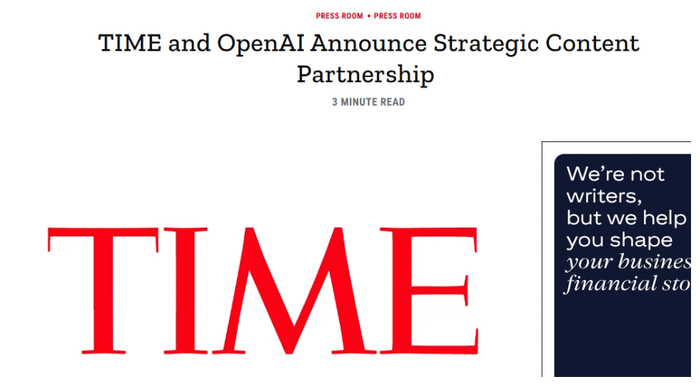据新闻稿介绍,OpenAI可以通过这笔交易访问《时代》过去100多年的档案和文章,以训练其AI模型,并在其面向消费者的产品(如ChatGPT)中用于回复用户的询问。