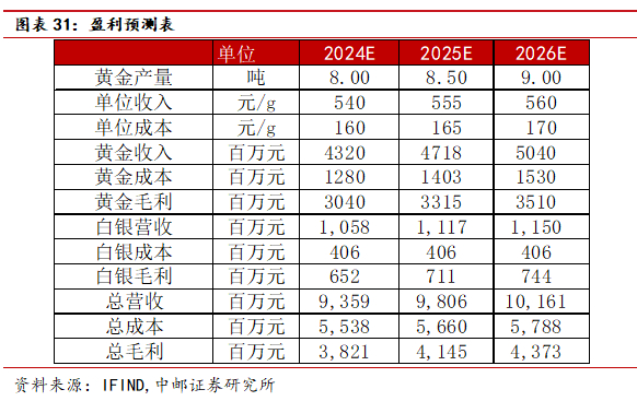 我们假设2024-2026年公司矿产金产量为8吨、8.5吨和9吨,销售成本为160、165、170元/g,白银产量维持在193吨左右。黄金板块收入预计为43.2亿、47.18亿和50.40亿元,毛利预计为30.40亿、33.15亿和35.10亿元。
