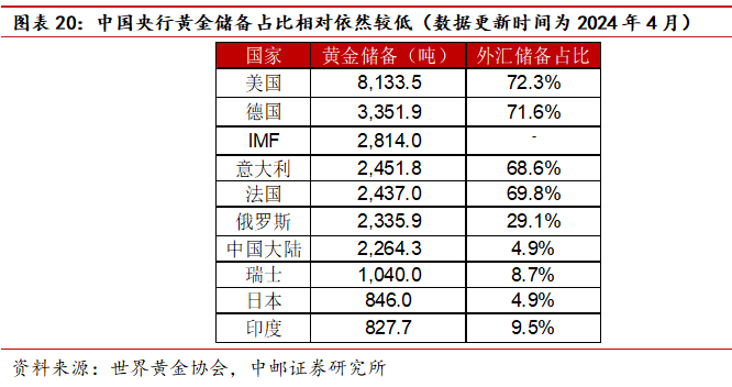 从长期来看,中国目前的外汇储备中,黄金占比为5%左右,相比美国、德国以及其他欧洲国家依然有较大的差距,未来继续购入黄金的空间依然较大。