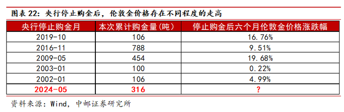 2024年5月中国央行停止购金引发了黄金市场的波动,我们认为该因素为短期扰动。