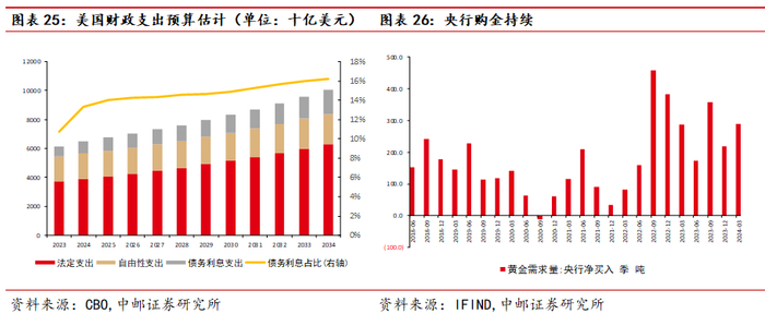 而目前美元资产的吸引力逐渐降低,对应美元占全球外汇储备的比重降低,这意味着美国财政部必须依靠更高的利率从而吸引国际投资者。而高利率无疑是一把双刃剑,一方面较高的利率可以加大美债的吸引力,从而帮助其获得外部融资,但是另一方面高成本的国债也无疑加大了财政支出的压力,从而造成赤字率的不断提升,最终侵蚀美债和美元资产的信用。根据美国财政预算办公室的预测,美国财政中债务利息占比在未来十年会不断提升,预计2034年超过总体预算支出的16%,如果考虑美国由于二次通胀的担忧从而使得降息节奏低于预期,这一比重可能还会继续提升,在法定支出刚性,自由性支出(国防支出为主)由于地缘政治不稳而难以下行的局面下,我们预计美国整体的赤字率水平会高于预期。