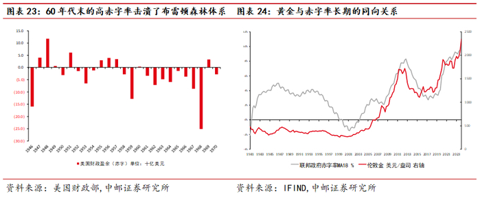 黄金从长期来看,与美国的赤字率强相关。尽管黄金早已不作为法币存在,但是其特有的货币属性可以认为是信用货币的一面“照妖镜”,信用货币背后的支撑即为政府信用,政府信用的可视形式即为赤字率。赤字率越高隐含其信用越弱,例如60年代美国在越南战争和“伟大社会”的进程下赤字率飙升,1968年美国联邦政府赤字达到了251亿美元,较1年前上涨了2倍,引发了各国开始挤兑黄金,而尼克松总统于1971年单方面宣布放弃金本位,不予兑换黄金,最终布雷顿森林体系崩溃。现如今虽然已不再是布雷顿森林体系,但是各国在储备资产方面依然考虑信用因素,抬升的美国赤字率会使得央行减少美元资产储备,转而使得黄金需求提升,最终造成黄金和赤字率的同向关系。黄金和赤字率的关系较为稳固,在实际利率大幅下行的80和90年代,黄金的下跌可以用赤字率的下行来解释,而实际利率的传统框架似乎曾经就不存在。