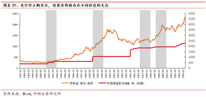 历史上来看,中国央行停止购金后往往伴随黄金价格的趋势性上涨,而并非市场担忧的行情转向。从历史上来看,中国央行对于黄金的择时胜率非常高,在2002年、2009年、2019年以及2022年,在中国央行停止增持黄金之后,金价都有不同程度的趋势性上涨行情,因此可以在一定程度上把中国央行的增持黄金看作是“抄底”。