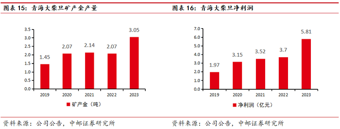 2023年青海大柴旦矿产金产量为3.05吨,相较2022年有大幅度提高,净利润达到5.81亿元。目前青龙沟金矿的采矿权证(扩大矿区范围)已经办理完成;细晶沟金矿(新立)采矿权青海省自然资源厅已经审查完毕,等待进一步批准意见,未来青海大柴旦的储量和产量有望继续提升。
