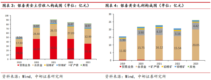 合质金和矿产银贡献公司主要盈利来源。公司收入结构来看,近年来公司贸易戏份逐渐减少,合质金和矿产银的比重逐渐提升。从毛利结构来看,2023年合质金板块毛利为20.05亿元,占比77%,与矿产银合计24.47亿元,占比超过94%。