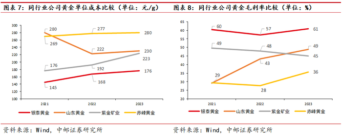 银泰黄金成本控制能力强,矿产金盈利能力遥遥领先同业。我们选取了2021年-2023年赤峰黄金,山东黄金和紫金矿业的矿产金业务作为对比,银泰黄金的矿产金单位成本显著优于同业,2021-2023年分别为145、168、176元/克,成本逐渐上行的原因为公司产量受到一定扰动摊高了固定成本部分,但总体的克成本以及毛利率水平在同业公司的对比中依然有较大领先。2021-2023年银泰黄金矿产金毛利率分别为60%、57%、61%。