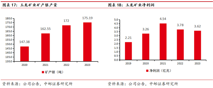 玉龙矿业矿产银产量逐年稳步攀升,2022年矿产银产量为172吨,2023年提升至175吨, 2023年净利润为3.62亿元。