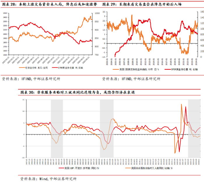 交易盘入场实际需要等待降息的确认,目前对实际利率敏感的交易型资金还未入场,甚至为负贡献。24年黄金大涨的局面下,全球最大的黄金ETF基金——SPDR的持仓量并未有上涨的情况发生,反而相比2024年初(大涨前)的持仓量却有所下降,说明利率敏感型资金在本轮黄金上涨中参与和贡献为负。从历史上看,SPDR的入场一般在实际利率出现确定性下移之后,因此我们认为若后续美国货币政策出现转向,SPDR为代表的交易盘入场,可能会加速本轮黄金的上涨势能。