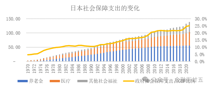 为了维持相对较高的养老福利制度,日本政府的财政支出承担了巨大的压力,其社会保障费用占GDP的比例也正逐年攀升。2021年度,日本社会保障费用为138.7兆日元,占总GDP的25.2%。其中,养老金为55.8兆日元,占GDP的10.1%,医疗与社会福利(包括儿童)为82.9兆日元,占GDP的15.1%。详见图6。