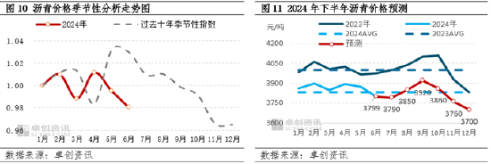 综合上述分析,卓创资讯对《2023-2024中国沥青市场年度报告》中关于下半年的趋势预测进行修正,预计三季度沥青月均价均处于环比走高的态势,随后随着市场需求预期的兑现以及需求的季节性走弱,沥青价格环比走低,下半年主流运行区间在3700-3920元/吨,最高点有望出现在9月份,低点出现在12月份。(具体价格预测参考图11)