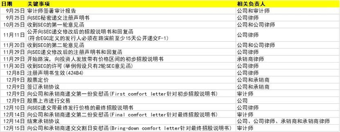 公司在第一次向SEC密交注册声明书后,公司会收到SEC的意见函,并在完成对意见基本回复后进行公开递交,制定价格区间,开始路演,并在最终得到SEC的许可、注册声明书生效后,完成最终的定价和签署承销协议,审计师也将向公司和承销商递交安慰函。