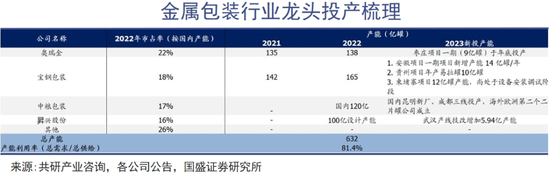 奥瑞金、中粮包装、宝钢包装都是国内金属包装龙头,以收入论座次,分属第一、第二和第三名。以产能来比较,奥瑞金排在头名,其余两家相差不大。