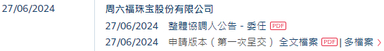 2024年6月27日,来自广东深圳的周六福珠宝股份有限公司 Zhou Liu Fu Jewellery Co., Ltd.(简称"周六福”)在港交所递交招股书,拟在香港主板发行H股上市,并申请全流通。