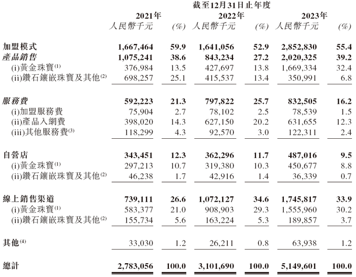 加盟模式的收入,公司大部分收入来自加盟模式,包括向加盟店销售产品、向加盟商收取加盟服务费、向加盟商收取产品入网费,以及其他服务费包括来自授权供应商的供应链管理费、来自装修服务供应商的装修管理费、向加盟商收取与钻石镶嵌珠宝有关的业绩保底费(主要是2021年的业绩保底费)。