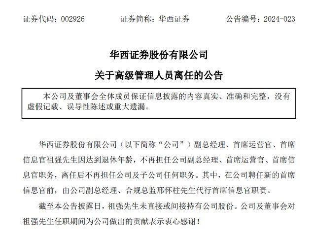 华西证券发布公告称,副总经理、首席运营官、首席信息官祖强因达到退休年龄,不再担任上述职务,离任后不再担任公司及子公司任何职务。
