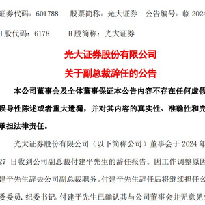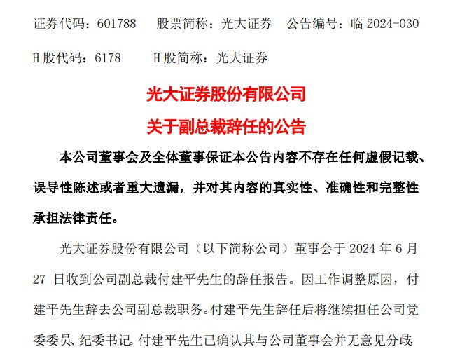 光大证券发布公告称,董事会于2024年6月27日收到副总裁付建平的辞任报告。因工作调整原因,付建平辞去公司副总裁职务。付建平辞任后将继续担任公司党委委员、纪委书记。