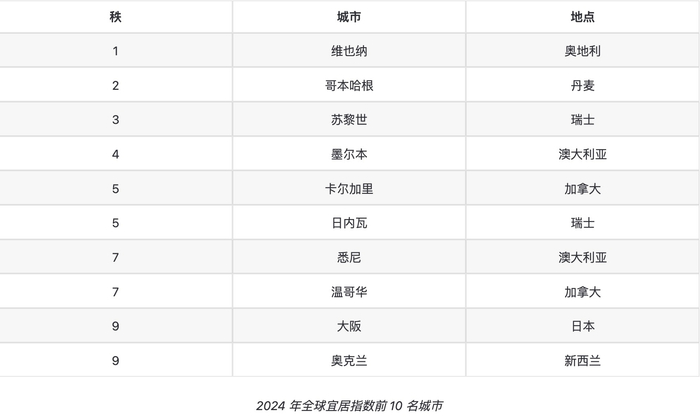 此外,澳大利亚的墨尔本和悉尼、日本的大阪和新西兰的奥克兰四个亚太城市也进入了最宜居城市前十名。