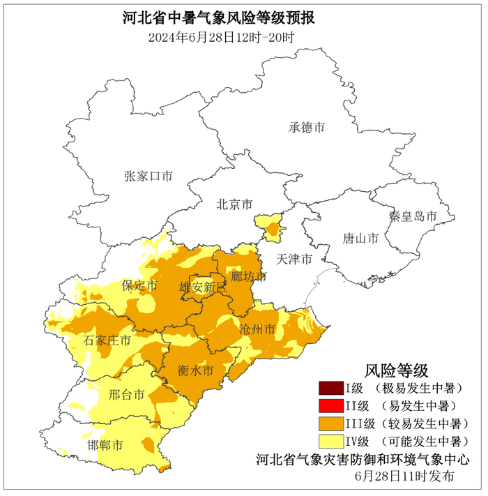 河北省气象灾害防御和环境气象中心2024年6月28日11时发布中暑气象风险等级预报: