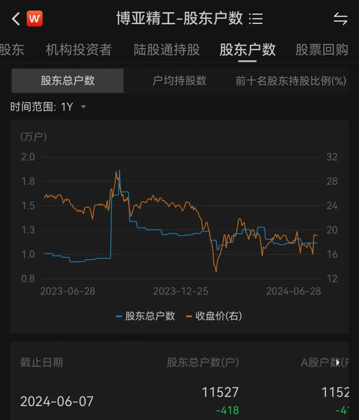 截至6月7日,博亚精工拥有股东总户数11527户。