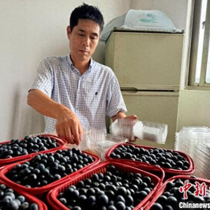 周畅江将新鲜采摘的蓝莓装盒。项菁 摄