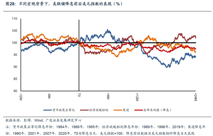 总结来看,(1)当预防性降息引导经济保持韧性,则美元保持强势(1995年),且不排除进一步走强;(2)当预防性降息并未能阻止衰退发生,则美元指数走弱(1989年);(3)一些外生因素比如财政持续扩张、非美经济基本面相对偏弱等可能导致美国经济基本面或者海外资本流入持续偏强,形成高利率-高资本回报率-高资本流入-高利率-强美元循环(1984年)。