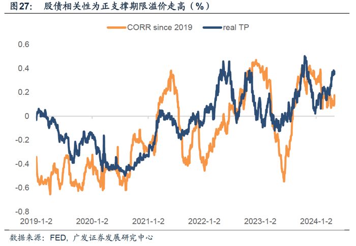 但当经济主要受供给冲击,股债更容易正相关,即GDP和通胀会反向变化。央行会因为高通胀而提高利率,导致债券价格回落,但股价也会因为折现率过高而回落,这个时候,分母端对股价的影响占主导,股债呈正相关。疫情以来,股债相关性为正的时期更多,引导期限溢价回升。
