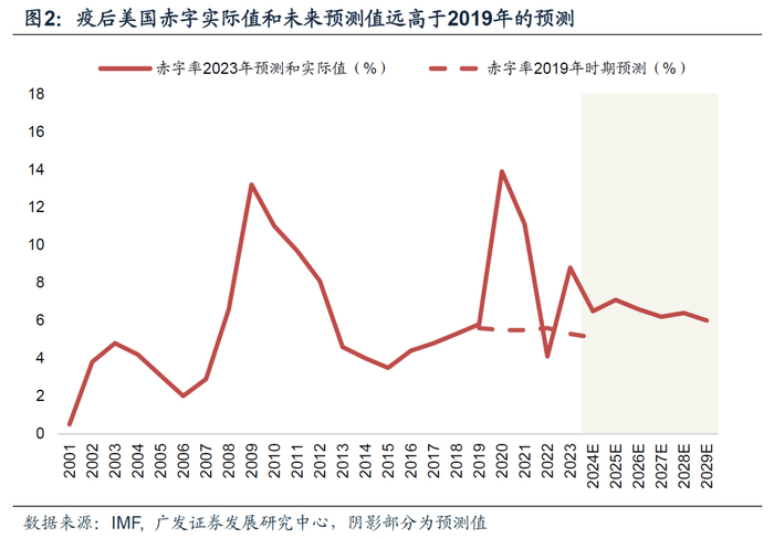 第一,2024年6月18日,美国国会预算办公室(CBO)发布对未来10年预算的最新展望,CBO预计2024年和2025年美国财政赤字率可能分别达到7.0%和6.5%,并在未来10年保持在6%左右水平,远高于过去50年3.7%的均值。4月17日IMF发布的最新全球财政跟踪报告预计美国财政赤字可能在2025年达到7.1%(2019年为5.8%,疫情最高点为13.9%),并在中期维持在6%以上。简单来看,美国高财政赤字率有长期化的倾向,这是近年海外宏观面最大的变化之一。如何看待其高赤字率的长期化是一个重要问题。