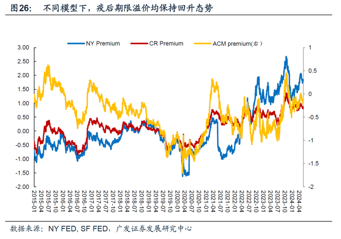 我们这里想要继续探讨的是美国赤字率对美债收益率的影响。理论上来说,所有作用于名义GDP的逻辑都会影响利率。赤字率上升支撑美国实际GDP、抬高其通胀中枢、提振债券供给,均会导致美债收益率走高。但值得注意的是,在美国实际增长放缓、通胀整体下行、加息周期结束的背景下,为何美债收益率还徘徊在高位?期限溢价可能是一个重要的观察视角。10年期美债收益率可以拆分为风险中性利率和期限溢价两部分,近年来期限溢价的上升是一个重要变化。ACM模型、DKW模型、纽约联储的调查数据预测的期限溢价在疫情开始后都有不同程度回升。期限溢价本质上是对投资者持有长期债券的风险补偿,它的系统性走高,可能和市场眼中中长期不确定性的上升有关。若我们以风险中性利率为3.5%左右水平,期限溢价预计为0.8%左右水平(3模型平均),10年期美债收益率中枢可能在4%-4.5%左右水平。
