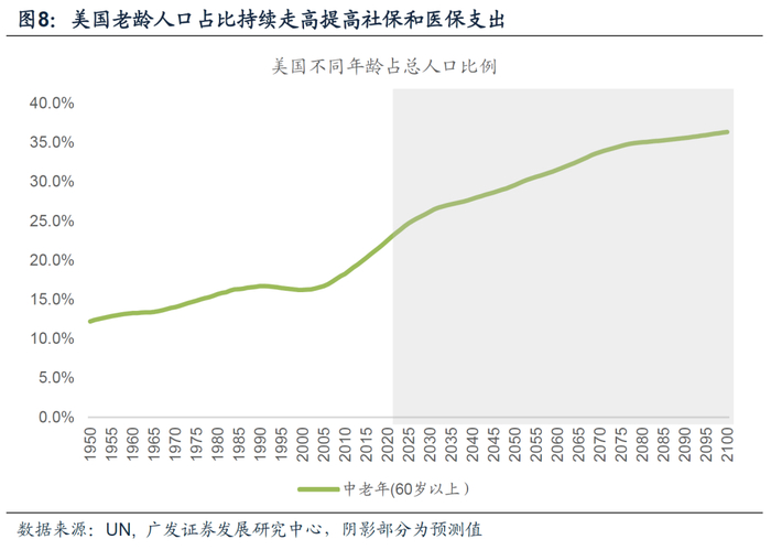 老龄化加剧导致社保、医保方面的支出趋势上行。根据CBO对于人口的预计,在未来十年美国婴儿潮(Baby-boom Generation)人群逐渐进入退休年龄,CBO预计,社会保障支出将从2023年占比GDP的5.2%到2034年约6%。UN预计,美国老年人口(60岁以上)占总人口比例将从2020年的20%左右上升至2034年的27%,对社会保障支出形成压力。并且随着预期寿命的逐渐增加,进一步加重社保压力。