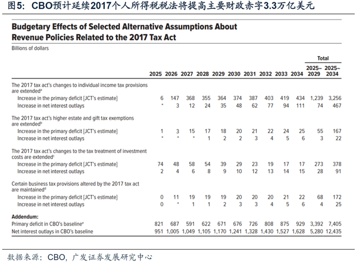 2024年美国大选的候选人特朗普亦在America First Policy Institute中表态,为了达到4%经济增长,将把2017年推出的Tax Cuts and Jobs Acts变成永久性法案。CBO预计,如果继续2017年推出的个人所得税税法,则2025-2034年期间主要财政赤字会比基准情形高出3.3万亿美元(基准情形为7.4万亿美元)。
