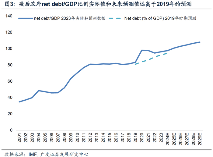 第二,从成因上来说,美国高赤字率源于其在疫后选择了用政府部门加杠杆来对冲私人部门衰退风险。这一模式的成本是其赤字率飙升、通胀中枢走高,货币政策以“走钢丝”的方式逐步调整;收益是美国经济绕开了资产负债表衰退。美国2020-2021(两年平均)、2022、2023年实际GDP分别为1.8%、1.9%、2.5%。2024年预计为2%左右。