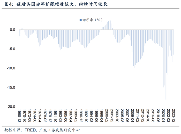从成因上来说,美国高赤字率源于其在疫后选择了用政府部门加杠杆来对冲私人部门衰退风险。这一模式的成本是其赤字率飙升、通胀中枢走高,货币政策以“走钢丝”的方式逐步调整;收益是美国经济绕开了资产负债表衰退。美国2020-2021(两年平均)、2022、2023年实际GDP分别为1.8%、1.9%、2.5%。2024年预计为2%左右。