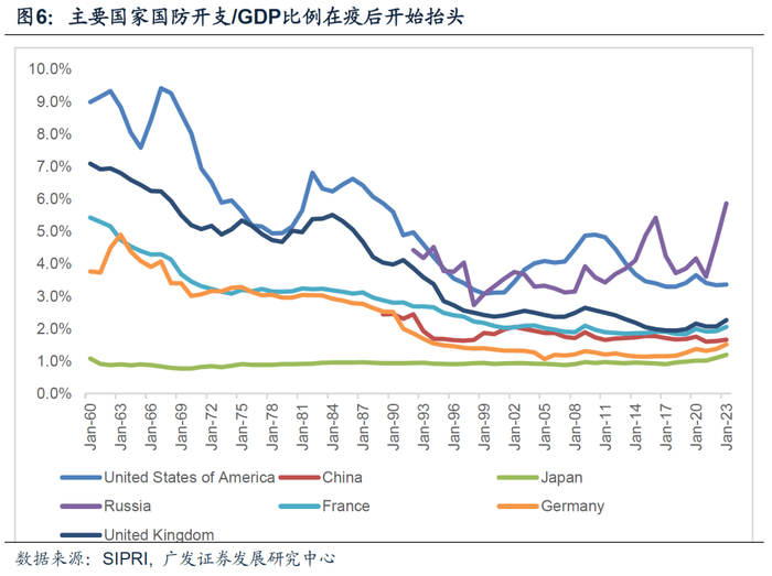 国防支出方面,俄乌冲突之后全球军事支出已经开始显示出较明显的回升。美国方面尤为突出。CBO预计国防开支上行斜率偏陡峭,到2034年美国国防开支将增加至1.07万亿美元(2023年为8910亿美元)。在CBO的6月预测中,预计对海外军事援助的资金会在未来几年持续,预计增加赤字1.6万亿美元。
