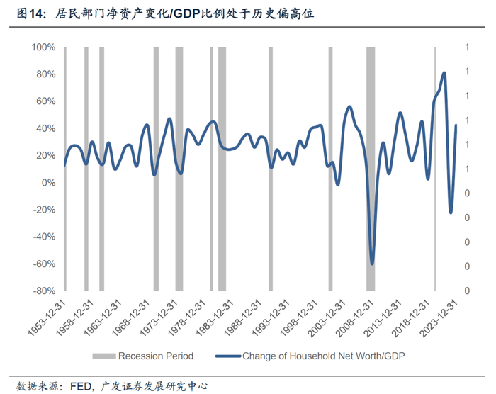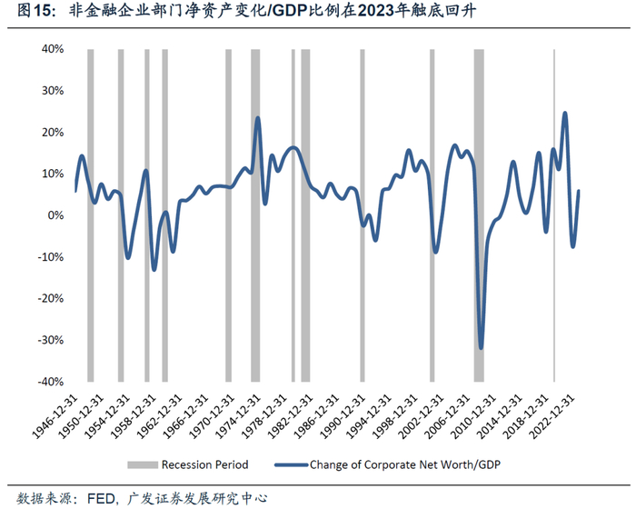 我们理解,通胀和利率水平(r)代表着高赤字率的成本(政府偿债成本),经济增速(g)代表着高赤字率的收益(经济增长)。财政是否可持续,本质上还是要落脚到两者的差值,即r-g。就短期来看,美国的r-g仍有望保持平衡:一则本轮财政扩张规模大、持续时间长,居民和非金融企业部门净资产/GDP比例仍高于疫情前水平,因此美国实际GDP增速虽然处于放缓周期但绝对值并不低。二则名义GDP回落最终会触发降息,对r形成压制。