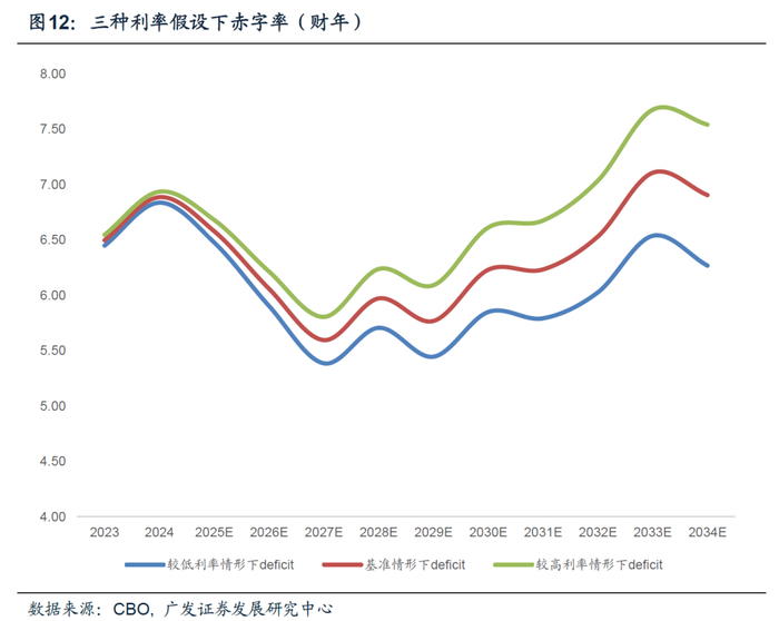 第四,这种赤字率抬升是否可持续?一种较普遍的理解是利息支出会形成越来越严重的约束。但从数据来看,利息可能不是重点。根据CBO“不同经济情形下预算展望”测算,基准情形下,2024财年利息支出占GDP比例可能从2023财年的2.66%上升至3.29%,2034财年上升至4.1%。我们在CBO预测的基础上进一步做了情形测算,在较高和较低利率情形下,2024财年利息支出占GDP比例分别为3.34%和3.24%。从这个结果来看,利息支出对赤字率可持续性的影响大致可控。