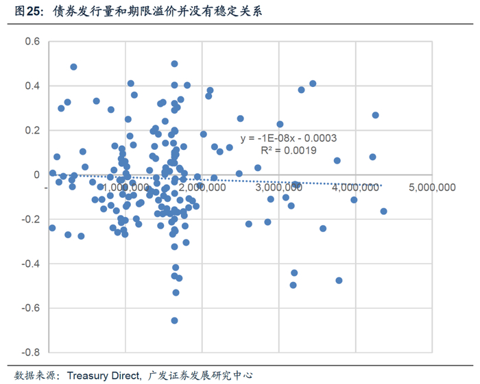 期限溢价反映投资人持有长期债券要求的额外回报。虽然近几年财政支出上行导致政府债券供给不可避免的走高,但我们并不认为这和期限溢价有必然关系,从历史数据来看,美债期限溢价变化和美国债券发行数量并没有稳定关系。
