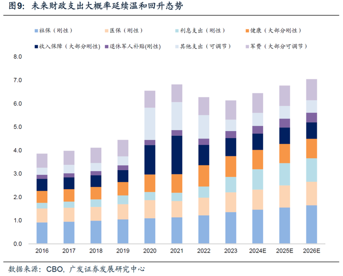 在经济着陆后为何赤字率还在高位?值得注意的是,高赤字率补贴企业和居民部门的模式存路径依赖特征,会有很强的“退出粘性”,即只能扩大很难缩小。美国大选背景又加剧了这一特征。比如特朗普在AFPI网站上承诺,他希望把2017年推出的Tax Cuts and Jobs Acts变成永久性法案。CBO预计,延续2017年推出的个人所得税税法将导致2025-2034年期间主要财政赤字比基准情形高出3.3万亿美元(基准情形为7.4万亿美元)。此外,地缘政治开支、产业政策、老龄化等线索也均为赤字率推手;对选民的迎合也会影响政策走向。