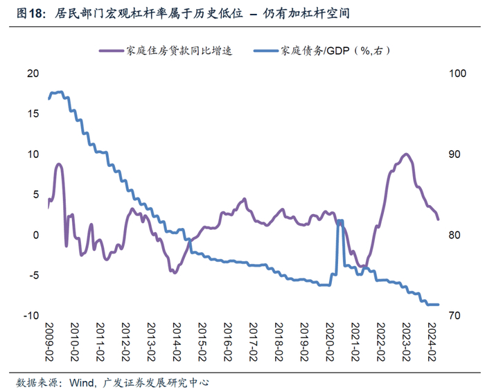 第三,地产方面,我们预计下半年地产投资较上半年弱一些,但全年住宅投资同比增速约为5%左右,较2023年的-10%回暖。需求端,基准情形下,我们预计美联储今年谨慎降息,一定程度上带动30年期房贷利率回落,支撑新房销售温和回升。中期看,美国家庭刚性购房需求以及较低的宏观杠杆率意味着降息后需求弹性较强。供给端,终端购房需求是决定新房供给最主要的因素。由于刚性需求以及杠杆率偏低,叠加房屋空置率历史低位,意味着供需偏紧,利率回落亦可以刺激新屋开工。
