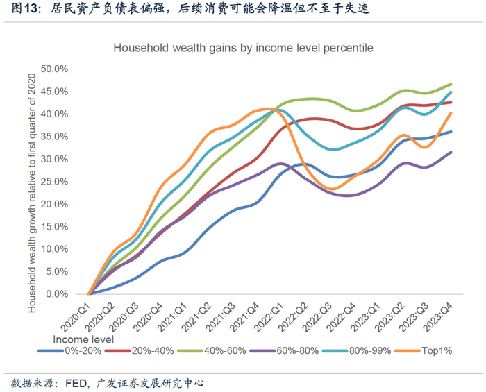 第一,美国居民消费降速但暂时不至于失速。现阶段,美国消费增速放缓是经济降温最主要的驱动因子,背景是薪资增速下降、额外储蓄用尽。表现形式为居民商品消费增速下降,服务消费增速韧性中放缓,信用卡和汽车贷款意愿持续回落。然而,美国居民资产负债表仍相对健康,不同收入群体自2020年疫情以来净资产回升均非常显著;企业部门净资产变化/GDP比例在2023年回升,且流动性资产充足、利润/GDP比例处于稳健水平。综合来看,我们倾向于认为,居民消费增速进一步正常化,但居民健康的资产负债表会托底消费,引导消费降温但不至于失速;而企业资产负债表偏强亦会托底就业,对收入形成支撑。