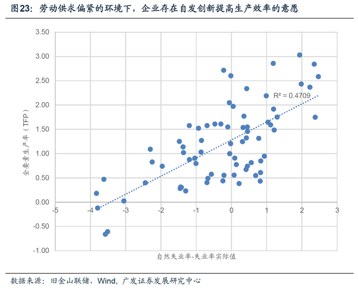 从中期来看,如果r中枢高于经验均值,r-g的平衡还是需要g有额外的驱动力量,比如全要素生产率的提升。简单理解就是,如果经济的产出效率能够支持多更多赤字和债务,它才能持续。市场目前对此有一定预期在于本轮技术变革,NBER报告《AI的简单宏观经济学》提到,AI以及效率提升可以导致全要素生产率在未来10年增加0.66个百分点。历史经验表明,政府财政支持下的产业政策能成功促进技术创新和效率提升,比如美国政府的NASA计划以及APRANET(互联网前身)研究都推动了当时科技的变革。此外,劳动供求偏紧的环境下,企业存在自发创新提高生产效率的意愿。