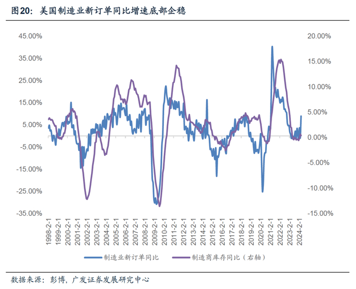 第二,制造业方面,从制造业库存角度来观察,现阶段美国制造业处于周期底部并出现边际修复迹象,领先指标如新订单增速以及资本开支调查亦有小幅回暖迹象,后续若美联储转向有利于制造业库存温和回升。