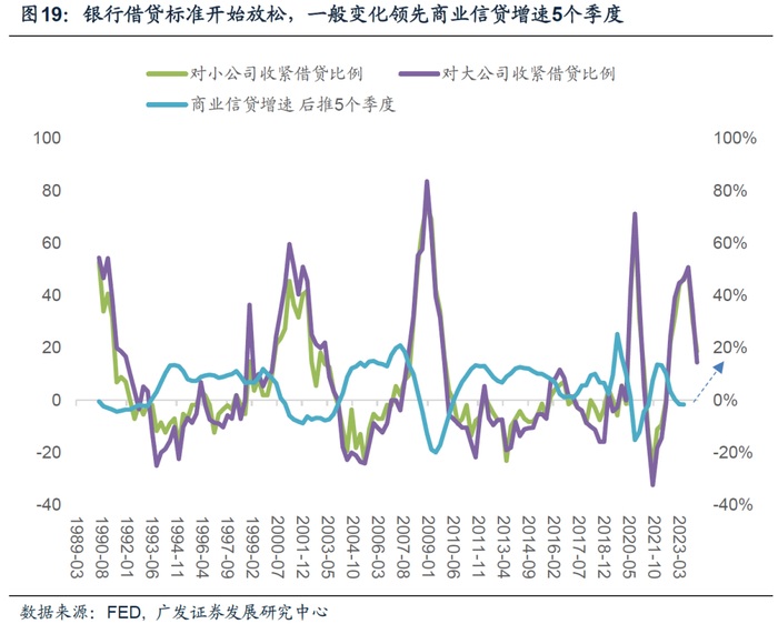 第四,从宏观数据来看,私人部门信贷领先指标已经触底回升,意味着信贷增速下行已经接近尾声,美联储降息将进一步带动信贷活动回温。居民方面,银行对居民部门住房借贷标准已经开始趋松,后续美联储降息带动30年期房贷利率回落,引导购房意愿回升。企业方面,美国工商业贷款的领先指标如银行收紧贷款意愿百分比触顶回落;意味着工商业信贷增速也已经接近拐点。