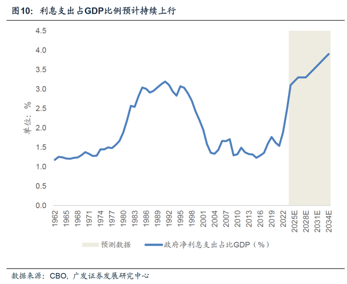 利息成本会随着债务积累而持续上行。政府净利率支出的未来走势主要取决于债务总量和利率走势。疫后美国政府债务总量快速上升,从2019年的23万亿美元增长至2024年约34万亿美元;且同时伴随美联储加息导致利率上升,两者同向增长显著增加政府利率支出。