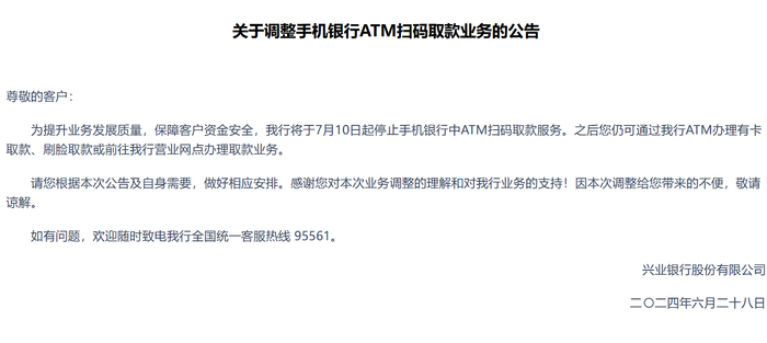 6月28日,兴业银行发布公告称,为提升业务发展质量,保障客户资金安全,该行将于7月10日起停止手机银行中ATM扫码取款服务。之后客户仍可通过该行ATM办理有卡取款、刷脸取款或前往营业网点办理取款业务。