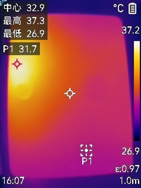 温度方面,机身背面最高温度的位置是芯片所在区域,刚好在正中间摄像头旁边,只有37.3摄氏度。